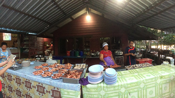 เสียกันเพลินจนเริ่มหิว เลยมารออาหารค่ำท่าจะเวิร์คกว่า ทางร้านจัดเรียงอาหารต้อนรับแขกหน้าทางเข้า เป็นวิธีเรียกน้ำย่อยได้ดี อาหารอร่อยมาก รสชาติดี และสามารถเติมได้เรื่อยๆ เพราะเป็นบุฟเฟ่ต์ จบด้วยผลไม้ 2อย่าง ก็ยังอร่อยอีก แทนที่ทานเสร็จแล้วจะกลับไปแฮงเอาท์ต่อกันที่บ้านพัก ดันเหลือบไปเห็นว่ามีคาราโอเกะตั้งโชว์อยู่กลางวงโซนอาหารพร้อมมีโปเจคเตอร์ติดผนังฉายเอ็มวี ได้อารมณ์แบบบ้านๆมากมาย เหมือนสมัยยุคเก่าๆ ที่เวลาไปเข้าค่ายหรือไปเที่ยวกับพวกผู้ใหญ่ ระหว่างทานอาหารค่ำหรือทานเสร็จ มักจะร้องเพลงประชันกันเสมอ ความทรงจำแบบนี้ในวัยเด็กก็พรั่งพรูขึ้นมา พวกเรานั่งรอผู้กล้าสักกลุ่มเปิดฟลอร์ แรกๆก็ร้องตามเขา ปรบมือ โฮฮิ้วกันไป