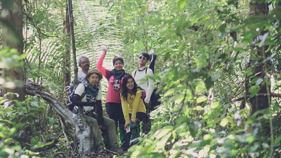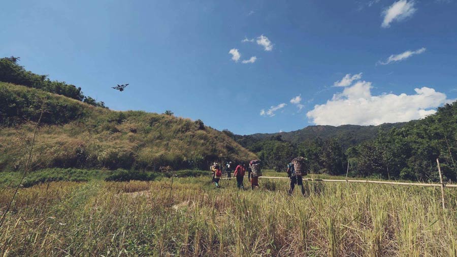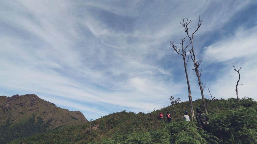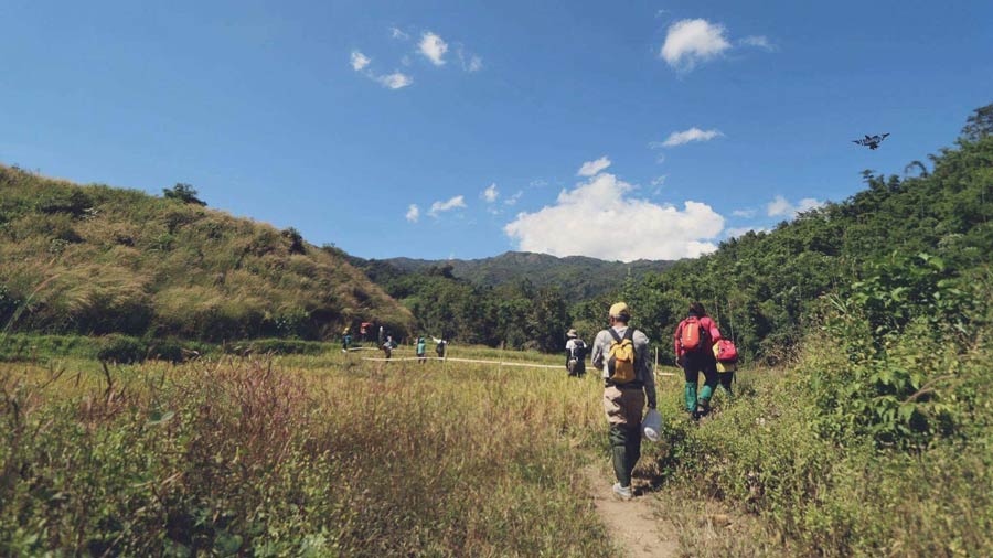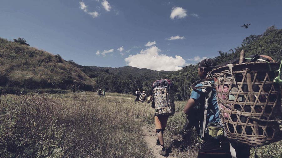 เส้นทางช่วงแรกเป็นทางเดินราบผ่านทุ่งข้าว ทุ่งนาชาวบ้าน เดินเรื่อยๆสบายๆ ก่อนตัดเข้าสู่ป่า เปลี่ยนโหมตเป็นทางชัน และชันเพิ่มขึ้นไปอีก ระยะทางประมาณ 5 กิโล ก็ถึงจุดตั้งแคมป์สำหรับพวกเรา ก็ถือว่าไม่สาหัสสากันมากมาย แม้ว่าจะมีช่วงชันดิ๊กเลย แต่ด้วยความที่ระยะทางเดินไม่ยาวมาก เรื่องทากก็ไม่เจอนะ ก่อนมาก็โดนขู่กันมาอย่างหนักว่าทากเยอะ แต่ช่วงเราไปความชื่นน่าจะลดลง ผ่านเลยช่วงฝนหนักๆไปแล้ว ควาฉุ่มแฉะเลยมีน้อย น้องทากเลยไม่โผล่มาให้หวาดเสียว วันนี้เลยสวยสดงดงาม