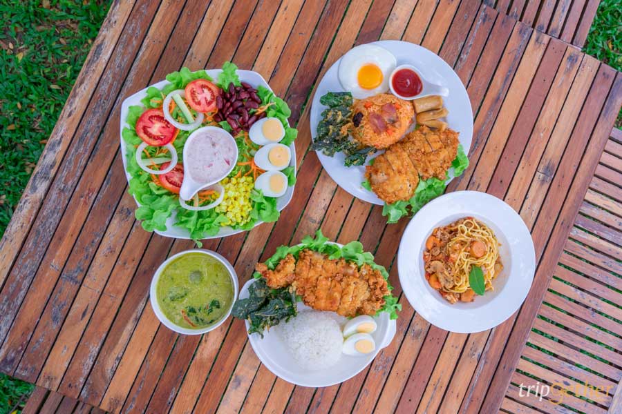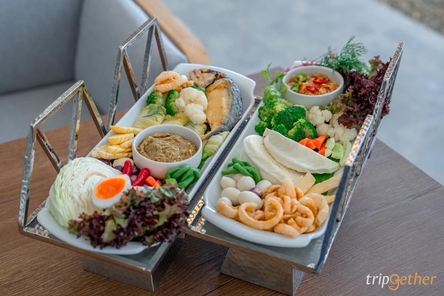 ในส่วนของเมนูเน้นเป็นอาหารฟิวชั่น โดยทางร้านมีเมนูให้เลือกหลากหลายทั้งอาหารไทยที่เป็นเมนูของจังหวัดกาญจนบุรี เช่น แกงป่า ผัดเผ็ด น้ำพริก และยังมีอาหารสไตล์ยุโรปอีกมากมาย บอกเลยว่าเราใช้เวลานานมากในการเลือกเพราะแต่ละเมนูน่ากินสุดๆ โดยเราสั่งเป็นเมนูซิกเนเจอร์ ชุดน้ำพริกสะพานแม่น้ำแคว ที่ทางร้านตั้งใจนำเสนอสัญลักษณ์ของเมืองกาญจน์ผ่านเมนูอาหาร ซึ่งภายในเซ็ตจะเสิร์ฟน้ำพริกกุ้งสดที่รายล้อมไปด้วยเครื่องเคียงหลากหลาย ทั้งผักสด ผักต้ม กุ้งลวก และปลาทูทอดตัวโตๆ
