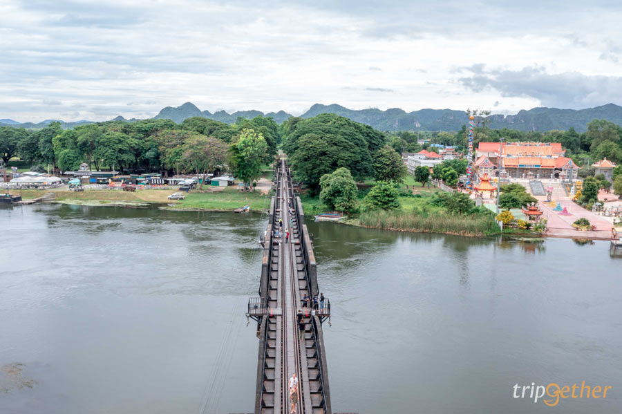 จากด้านบนสามารถมองเห็นวิวของแม่น้ำและทิวทัศน์ของแนวภูเขาที่โอบล้อมเมืองกาญจน์เอาไว้อย่างสวยงามเลยล่ะ แถมอากาศก็เย็นสบาย อยู่ที่นี่ได้แบบเพลินๆ โดยที่นี่ ไม่มีค่าเข้า แต่มีค่าบริการรองเท้าสำหรับเดินบนสกายวอล์คราคา 60 บาทคนไทย – ต่างชาติ ราคาเท่ากัน