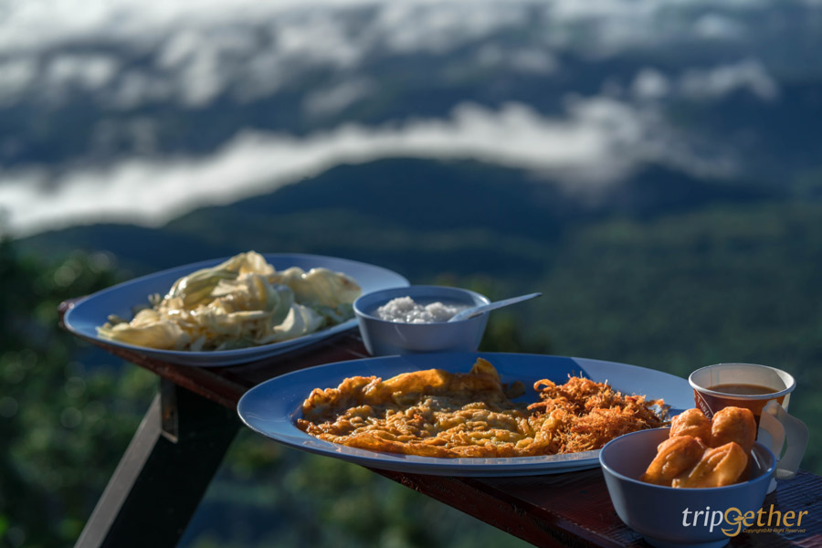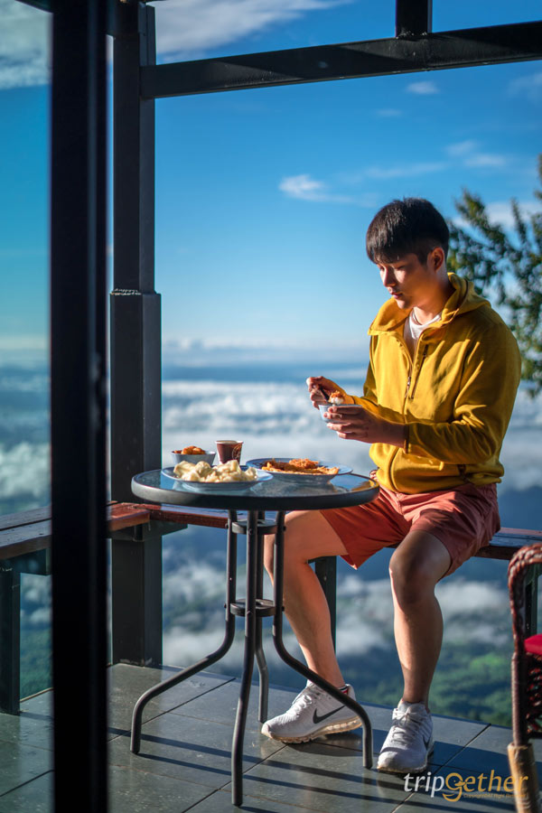 เช้าวันใหม่เริ่มต้นด้วยอาหารเช้าแสนอร่อยเสิร์ฟถึงห้อง มีทั้งข้าวต้มร้อนๆ ปาท่องโก๋ หมูหยอง ไข่เจียว และกาแฟเข้มๆ กลิ่นหอมกรุ่น กินไปชมวิวทะเลหมอกไปคือฟินเกินบรรยาย