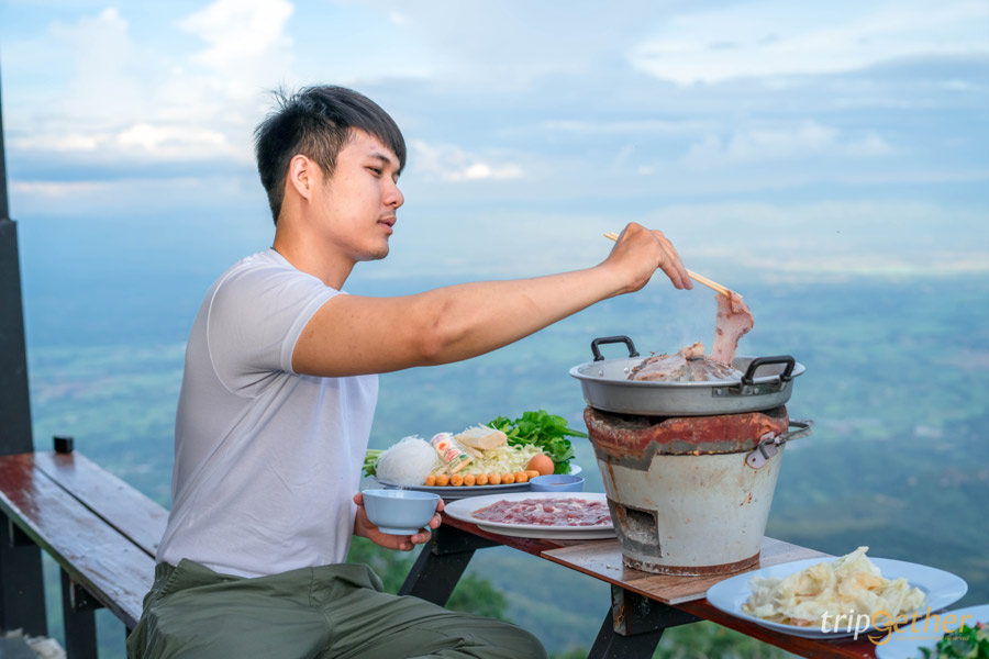 ตอนเย็นดูพระอาทิตย์ตกพร้อมหมูกระทะร้อนๆ บนระเบียงส่วนตัว นั่งห้อยขาริมระเบียงปิ้งหมูร้อนๆ บอกเลยว่าอร่อยฉ่ำ!