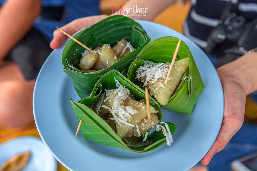 ก่อนปิดด้วยขนมหวานหน้าตาคล้ายข้าวต้นน้ำวุ้นภาคกลางแต่ที่นี่เป็นข้าวเหนียวก้อนสามเหลี่ยม โรยหน้าด้วยน้ำตาลและมะพร้าวอร่อยไปอีกแบบ ถามชื่อขนมคุณป้าเค้ามาแล้วครับแต่จำไม่ได้จริงๆ ใครรู้จักทักมาบอกกันได้นะครับ