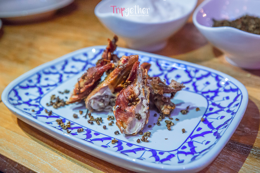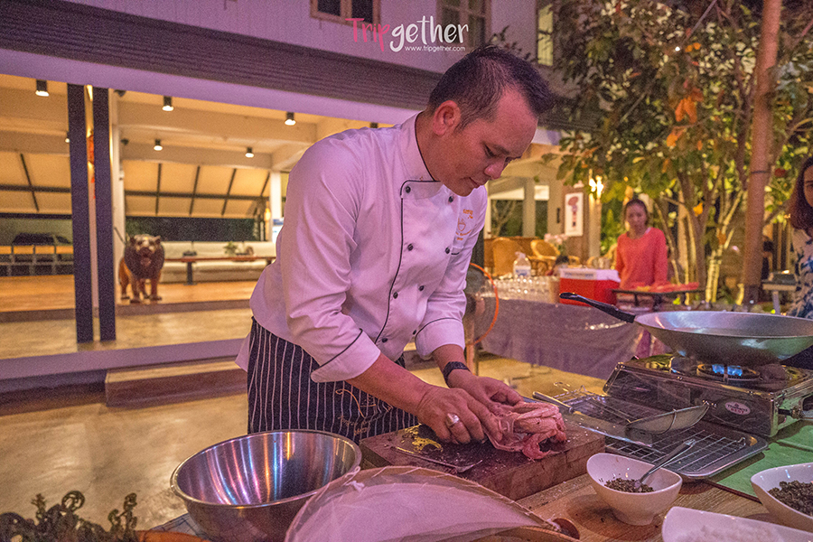 เก็บของเสร็จก็รีบลงมาดูเชฟทวนสาธิตวิธีทำไก่ทอดมะแขว่นกันเลย ส่วนด้านขวามือนั่นเป็นมื้อเย็นและออเดิร์ฟอื่นๆ ของทางรีสอร์ทครับ อร่อยไม่แพ้กัน