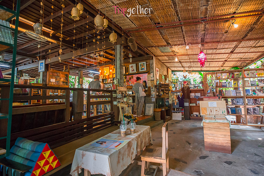 ตัวห้องสมุดแบ่งเป็น 2 ชั้น ด้านบนมีหนังสือสำหรับหยิบมานั่งอ่านอยู่เยอะพอสมควร ส่วนด้านล่างก็มีหนังสือประเภทเรื่องสั้น งานทดลองเขียน และของฝากอีกเล็กน้อยให้ได้เลือกซื้อเลือกชมกัน