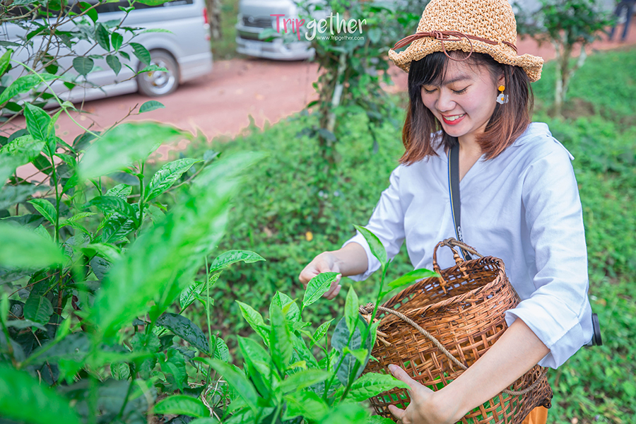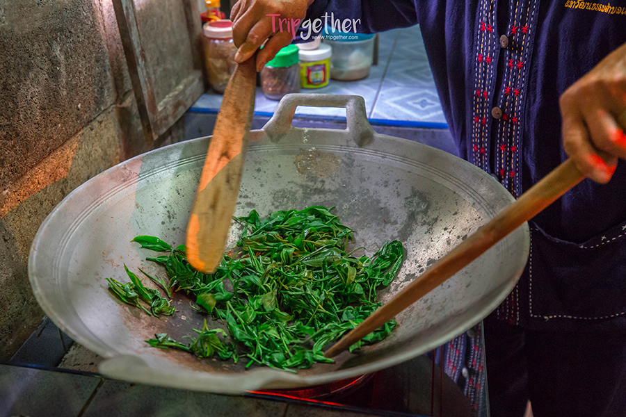 คุณลุงให้เราได้ทดลองเก็บใบชากันด้วยครับ ก่อนจะนำมาสาธิตวิธีคั่วใบชาแบบสดๆ ให้ได้ดูกัน