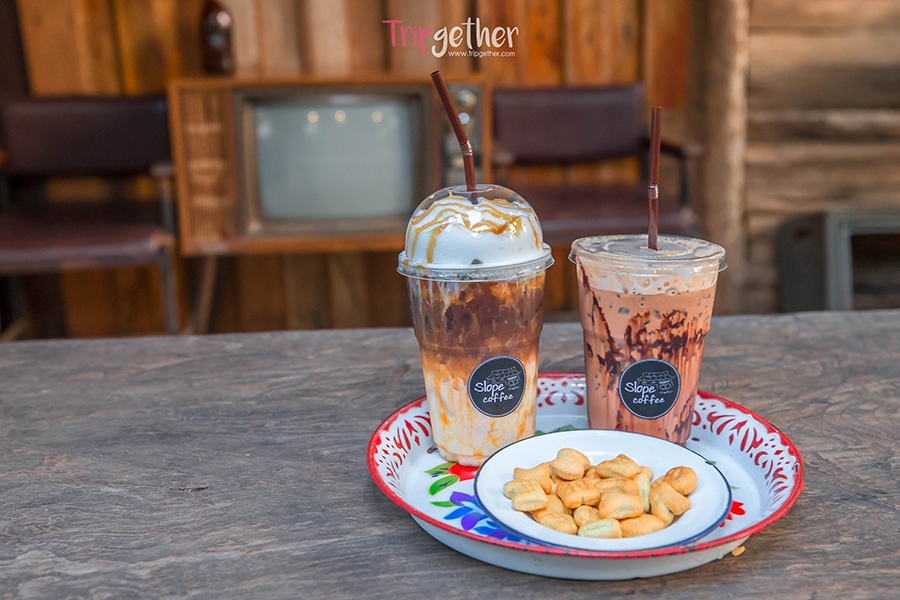 เมื่อเห็นว่าเวลาตามกำหนดการยังเหลือ พี่นันท์เลยเสนอให้ลองไปร้านกาแฟอีกร้านนึง ชื่อ Slope coffee ร้านกาแฟที่ตัวร้านเอียงลาดไปทางด้านหลังร้าน เออ น่าสนใจดีแฮะ มีคนเสนอก็ต้องมีคนสนองครับ สุดท้ายก็ตามกันไปหมดทั้งทริป