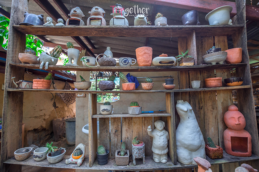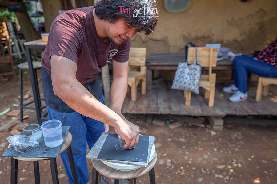 สำหรับไฮไลท์ของคำมีสตูดิโอแห่งนี้อยู่ที่ workshop ปั้นดิน ที่ให้นักท่องเที่ยวได้สร้างสรรค์งานของตัวเองขึ้นมา แถมใครที่หิวก็สามารถสั่งพิซซ่าหรือเบอร์เกอร์ของทางร้านมาทานได้อีกต่างหาก แอบเสียดายที่ตอนนั้นไม่ได้สั่งมาลองเพราะยังอิ่มขนมจีนจากปั๋นใจ๋กันอยู่เลย ซึ่งหลังจากเดินชมรอบๆ ได้สักพัก พี่โก้ เจ้าของสตูดิโอก็กล่าวแนะนำ ก่อนจะเข้าสู่ช่วงเวิร์กช็อป โจทย์ในการปั้นครั้งนี้แน่นอนว่าคือถ้วยน้ำชาครับ เอาไว้ใส่ชาที่เราจะได้ผสมเองในวันที่ 3 นั่นล่ะครับ