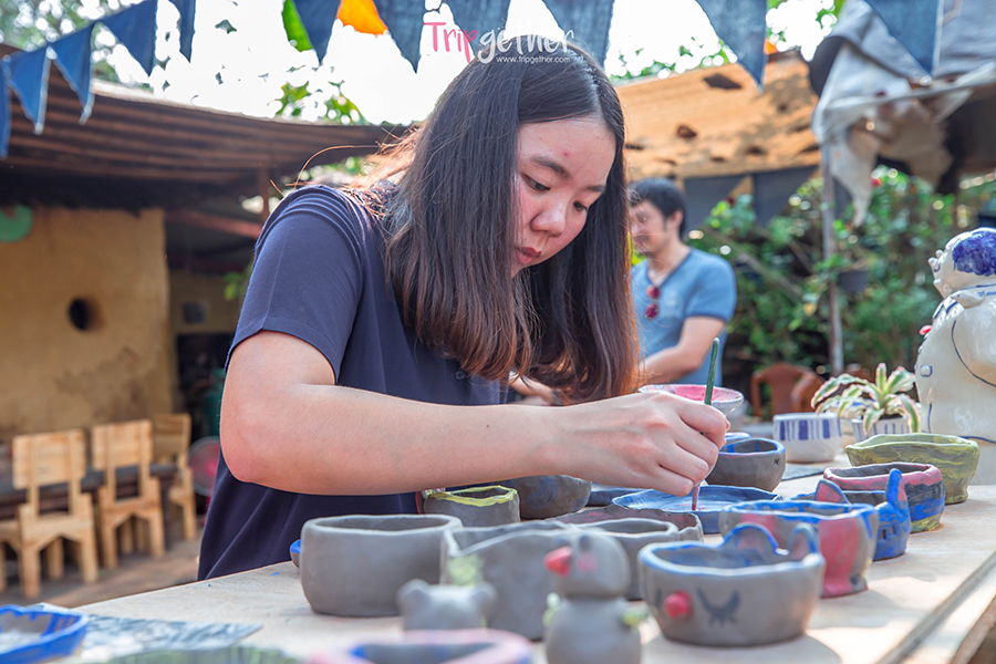 ใครที่ลังเลใจหรือกลัวว่าจะทำไม่เป็นไม่ต้องห่วงเลยนะครับ เพราะพี่โก้แนะนำและสาธิตทุกขั้นตอนแบบง่ายๆ สามารถทำตามได้เลยทันที ใครมีข้อสงสัยหรือต้องการความช่วยเหลือก็บอกได้ พี่โก้และทีมงานพร้อมเข้าไปให้ความช่วยเหลืออย่างเต็มที่ และในระหว่างทำพี่โก้ก็จะคอยบรรยายสอดแทรกความรู้ให้เราเรื่อยๆ อย่างเช่น ชนิดของดินที่นำมาผสมกันเพื่อให้ดินขึ้นรูปได้ ประเภทของสีที่ใช้ในงานเซรามิก ความหนาของงานปั้น ฯ ทำไปได้ความรู้ไป น่าจะถูกใจใครหลายคนเลยทีเดียว