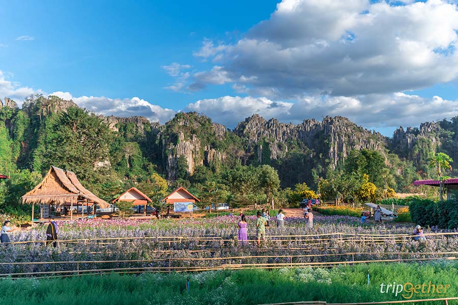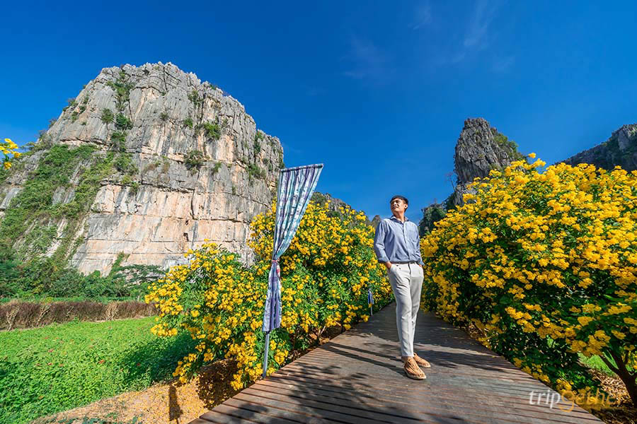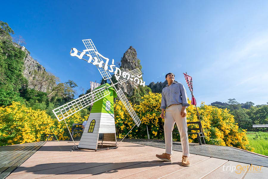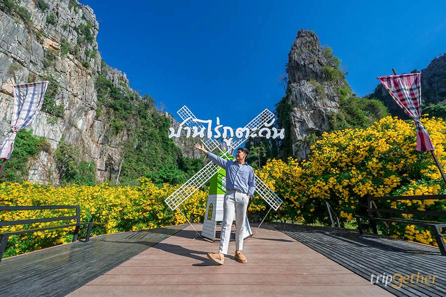 สำหรับจุดเด่นของที่นี่คงหนีไม่พ้นไร่ดอกทองอุไรสีเหลืองอร่ามที่ตัดกับสีของภูเขาหินปูนอย่างสวยงาม และยังมีสะพานทางเดินกลางไร่ดอกทองอุไรที่รับรองเลยว่าถูกใจสายเซลฟี่อย่างแน่นอน