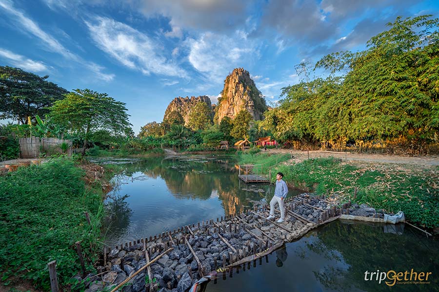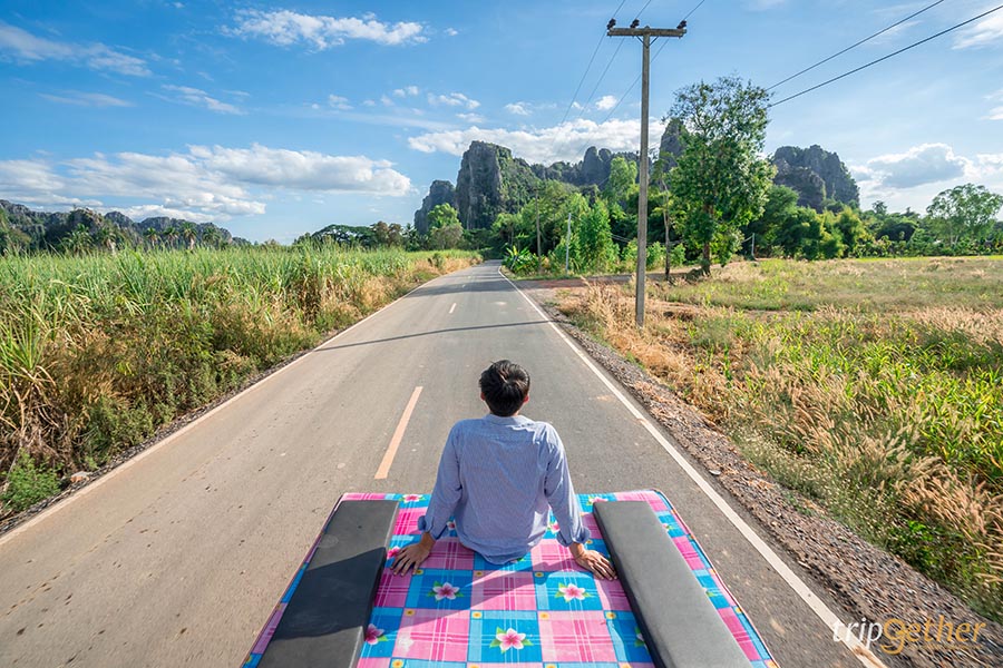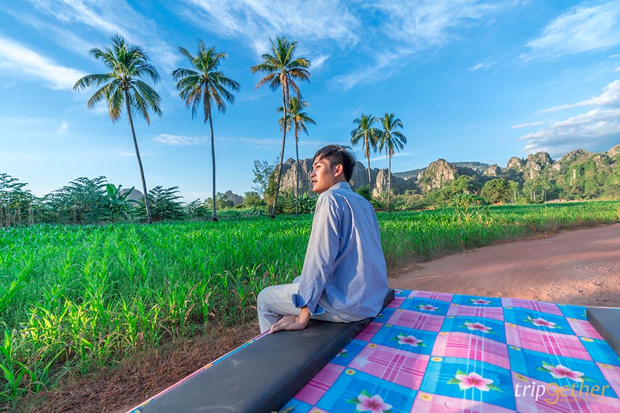 ซึ่งจะมีรถอีแต๋นมารอรับเราถึงที่พักเลย เนื่องจากหมู่บ้านบ้านมุงเป็นหมู่บ้านเล็กๆ ทำให้สถานที่ท่องเที่ยวภายในหมู่บ้านแต่ละจุดตั้งอยู่ไม่ไกลกันมาก และที่แรกที่เราไปคือ ภูเขาหินพระปรางสามยอด