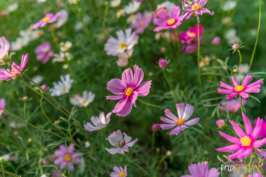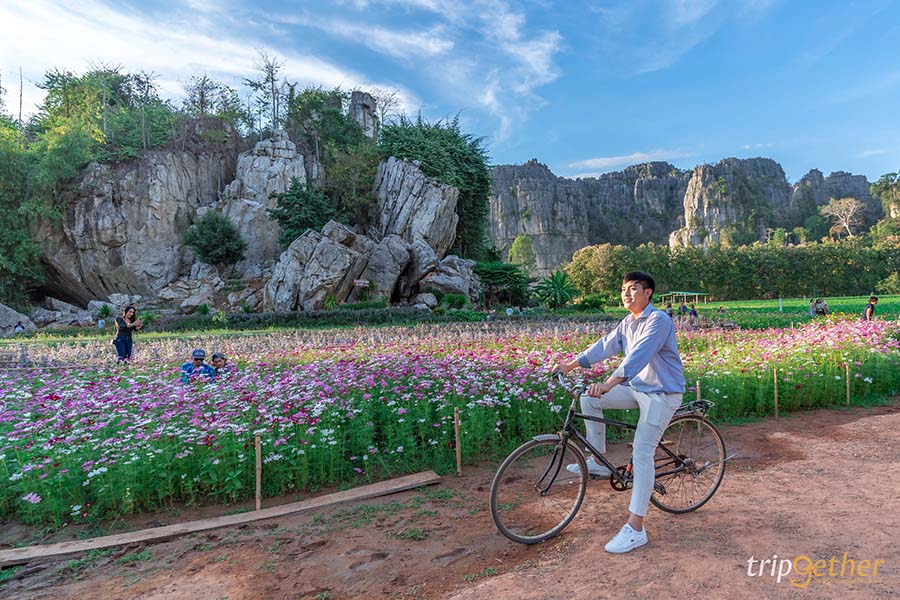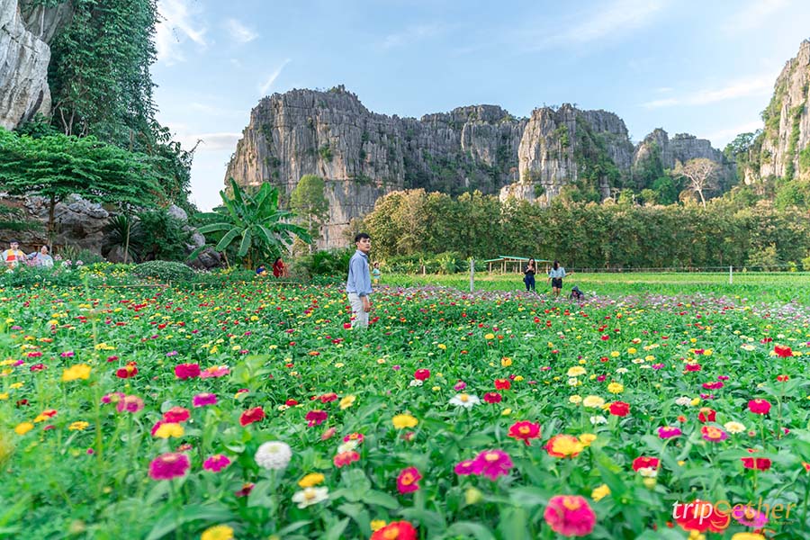 นั่งรถอีแต๋นนำเที่ยวชมวิวหมู่บ้านอยู่ไม่นานก็มาถึง @เขาน้อย 360 องศา สวนดอกไม้กลางเขาหินปูนสุดอันซีน ที่มีดอกไม้หลากหลายชนิดทั้งดอกคอสมอส ดอกคัตเตอร์ และดอกดาวกระจาย ซึ่งดอกไม้แต่ละชนิดจะเปลี่ยนแปลงไปตามฤดูกาล บอกเลยว่าที่นี่ให้ฟีลลิ่งเหมือนอยู่สวยดอกไม้ที่เชียงใหม่อย่างไงอย่างงั้น และที่สำคัญค่าเข้าเพียง 10 บาทเท่านั้น