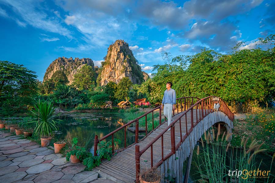 มุมสะพานไม้เป็นอีกหนึ่งมุมเก๋ๆ ที่เห็นทั้งวิวธรรมชาติแบบ 180 องศาและวิวภูเขาหินปูนเป็นฉากหลัง
