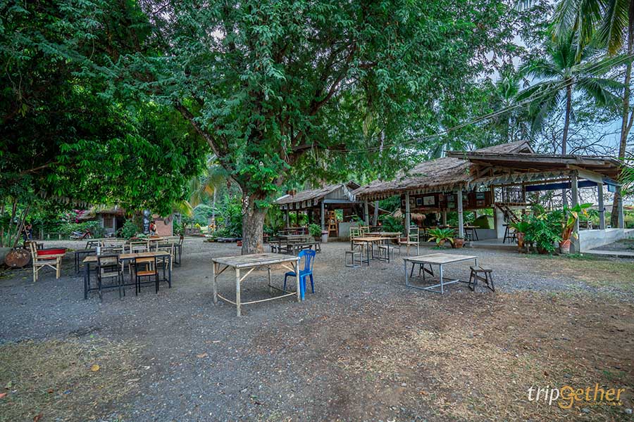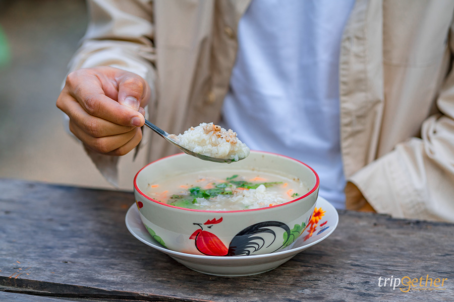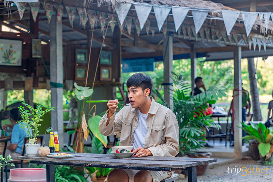 ทำบุญตักบาตรจนอิ่มบุญอุ่นใจแล้ว ก็ได้เวลากลับที่พักกินมื้อเช้าซึ่งถ้าหากใครที่นอนเต็นท์ของทางที่พักก็จะรวมอาหารเช้าไว้ในราคาเข้าพักแล้ว ซึ่งมี 2 เมนูให้เลือกคือ ข้าวต้ม และ ไข่กระทะ