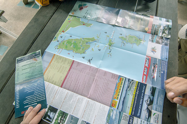 ระหว่างรอเรือ กำลังมาก็หาแผนที่กันก่อน มีแผนที่หยิบได้ฟรีครับ กางแผนที่วางแผนเที่ยวครับ
