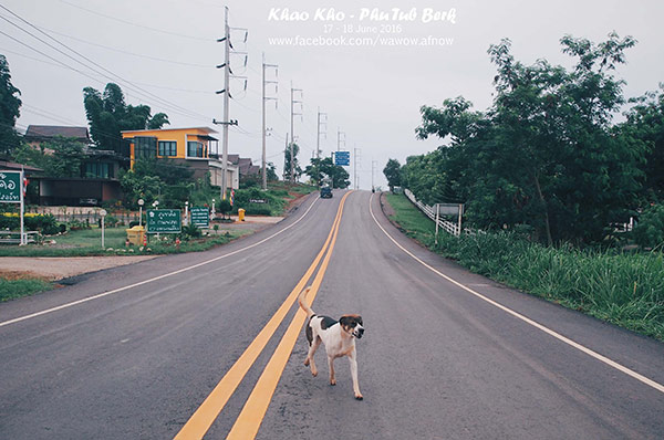 เดินกันไปสักพัก พวกเราเจอ “เจ้าถิ่น” อีกแล้ว ไม่ใช่นักเลงชื่อดังเขาค้อ หรือลูกสาวกำนันอะไรหรอกนะ แต่ที่พวกเราเจอคือ น้องหมาสี่ขาคับ พร้อมเขี้ยวฟันอันคมเปี๊ยว เหมือนพวกเราสะพายของพะรุงพะรังบวกกับคงไม่ค่อยมีใครเดินผ่าน มันตามเห่าไล่ เห่าไล่ เห่าไล่ คือเอาจริงๆตอนนั้น กลัวมาก กลัวยิ่งกว่าโจรอีก นี่แอบคิดในใจ มันจะแอบกัดกรุไหมเนี่ย น่องกรุยิ่งใหญ่ชวนหิวอยู่ด้วยTT พอเดินแบบเกร็งตัวได้ไม่นาน มีรถกระบะคันนึงผ่านมา ไม่รอช้าเรารีบโบกเลยจ้า คนในรถไปไหนไม่รู้ แต่คือขอไปจากตรงนี้ก่อน พวกหนูกลัวน้องหมา !!!!!