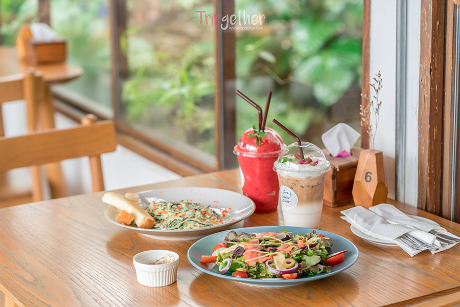 เมนูภายในร้านส่วนใหญ่จะเป็นอาหารฝรั่ง ส่วนเมนูที่เราสั่งก็จะหน้าตาประมาณนี้ครับ ลาเต้กุหลาบ สลัดแซลมอนรมควัน สปาเก็ตตี้เส้นดำผักโขมชีส สตรอว์เบอร์รีสมูทตี้ รสชาติหน้าตาอาหารและเครื่องดื่มที่นี่ดูดีไม่แพ้กันเลยทีเดียว