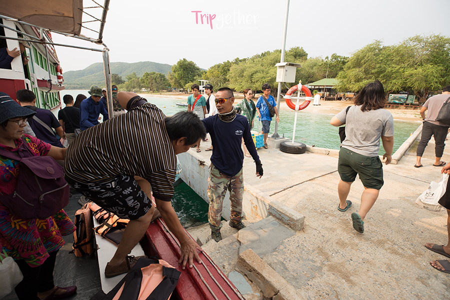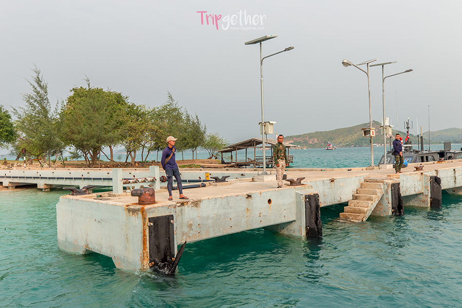 ถึงแล้วจ้า เกาะแสมสาร พี่ทหารรอมาต้อนรับเราเต็มเลย ฮ่าฮ่า ส่วนเรื่องขึ้น-ลงเรือ ไม่ต้องห่วงนะครับ เพราะมีพี่ๆ ทหารคอยช่วยที่ท่าเทียบเรืออยู่ตลอด รับรองความปลอดภัยได้เลย
