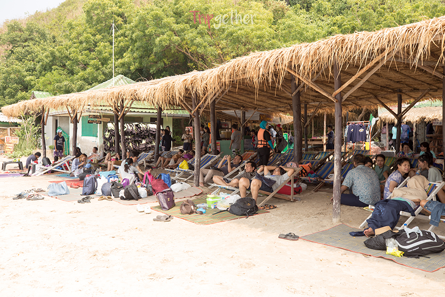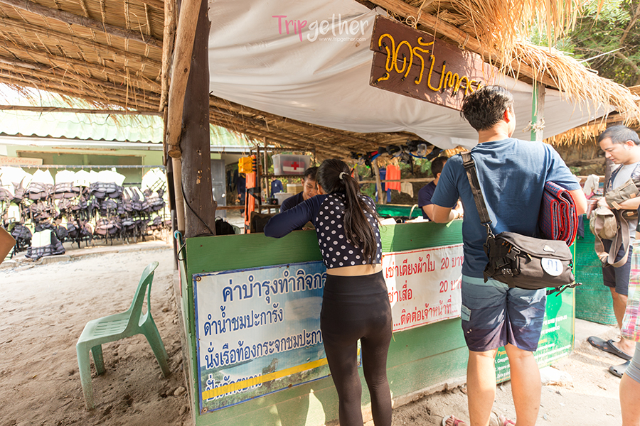 จุดนี้เป็นจุดจองคิวสำหรับบริการต่างๆ อย่าง คิวดำน้ำ ขึ้นเรือ เสื่อ เก้าอี้ชายหาด ล็อคเกอร์ หน้ากากดำน้ำ ฯ เราเสียค่าขึ้นเรือและดำน้ำไปกิจกรรมละ 20 และ 50 บาท/คน ตามลำดับ
