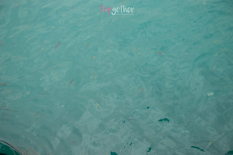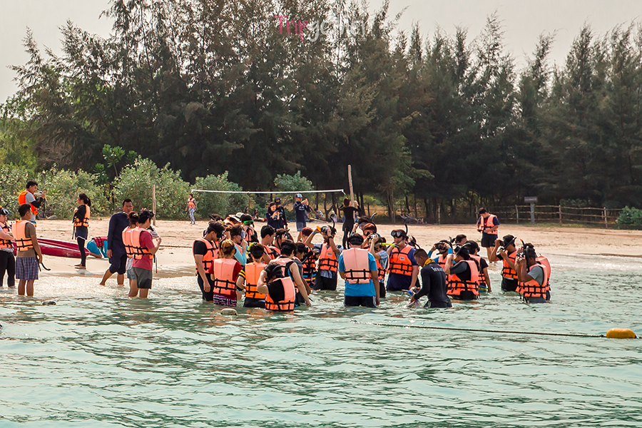 พอถึงคิวดำน้ำ ช่วงนี้ พี่ทหารจะพามาแนะนำวิธีการดำน้ำด้วยสน็อกเกิ้ลหรือหน้ากากดำน้ำตื้นพร้อมวิธีลอยตัวที่หน้าหาดก่อน ก่อนจะพาขึ้นเรือไปยังจุดดำน้ำ แล้วรอลำดับการลงจากเจ้าหน้าที่ โดยนอกจากปะการังและปลาทะเลขนาดเล็กแล้ว ไฮไลท์ของจุดดำน้ำตื้นคือบริเวณที่มีทุ่นสีน้ำเงินลอยอยู่ จุดนั้นจะมีปลาการ์ตูน หรือที่เราเรียกกันติดปากว่าปลานีโม่อาศัยอยู่ อันนี้พี่ทหารเน้นย้ำมาว่า หลังลงจากเรือในแต่ละกิจกรรม อย่าลืมเอาเสื้อชูชีพไปคืนที่จุดคืนเสื้อชูชีพแต่ละสีด้วยนะครับ