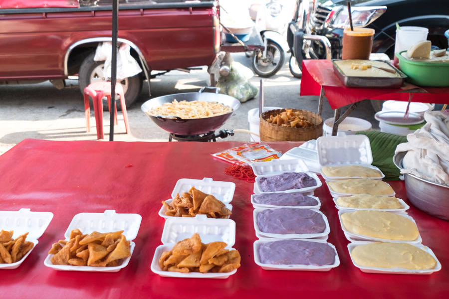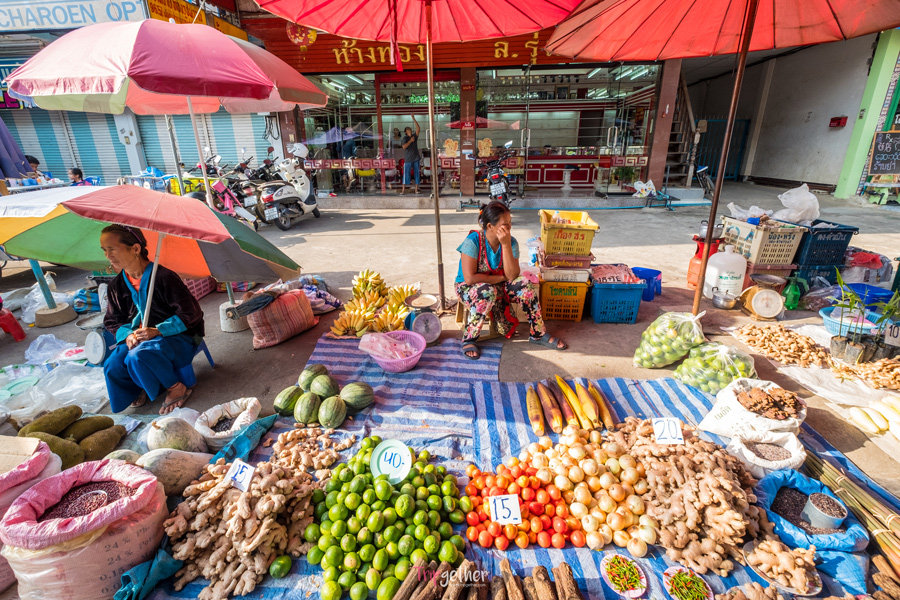 จากวัดป่าสัก ขับรถตามทางมาเรื่อยๆ จะมีตลาดบรรยากาศบ้านๆ มีทั้งอาหารและข้าวของเครื่องใช้ให้เราได้เลือกซื้อ เลือกชิม และแนะนำให้ลองข้าวแรมฟืน หรือข้าวแรมคืน ซึ่งเป็นอาหารดั้งเดิมของชาวไทใหญ่ ไทลื้อ ซึ่งปัจจุบันกลายเป็นอาหารท้องถิ่นชาวเชียงแสนที่ต้องลองชิมสักครั้งแล้วจะติดใจ!!
