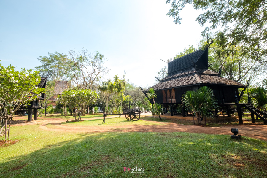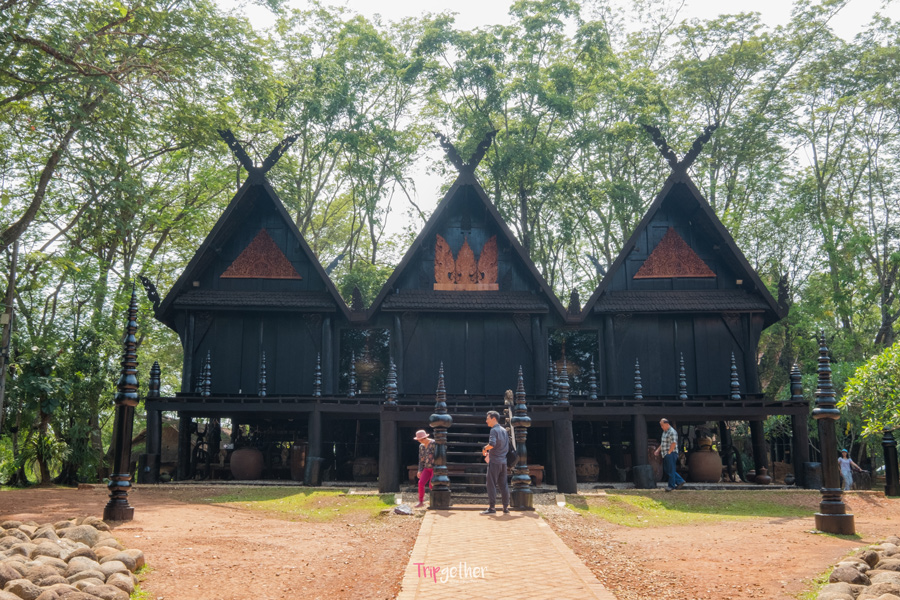 บ้านดำสร้างแบบศิลปะล้านนา บ้านทุกหลังถูกทาด้วยสีดำ ซึ่งเป็นสีที่อาจารย์ถวัลย์ชื่นชอบเป็นพิเศษและในบ้านแต่ละหลังยังประดับไปด้วยไม้แกะสลัก เขาสัตว์ ไม่ว่าจะเป็นเขาควาย เขากวาง และยังมีกระดูกสัตว์อีกหลายชนิด