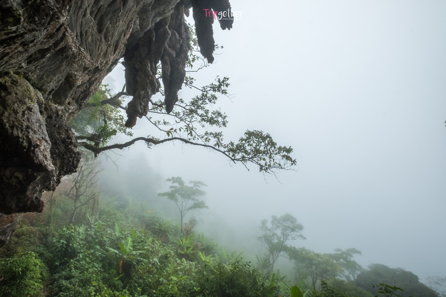 สำหรับจุดชมวิวผาตั้งมีทั้งหมด 7 จุดด้วยกัน โดยจุดแรก คือ ผาบ่อง ซึ่งเป็นช่องหินขนาดใหญ่ที่คนเดินลอดได้ ตั้งอยู่แนวหน้าผาจากจุดนี้มองเห็นทิวทัศน์ประเทศลาวได้อย่างสวยงาม แต่วันนี้หมอกหนาไปนิดเลยได้ฟีลเก๋ๆ หม่นๆ เหมือนกำลังเช็กอินอยู่สวิตเซอร์แลนด์เลยทีเดียว