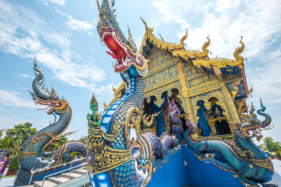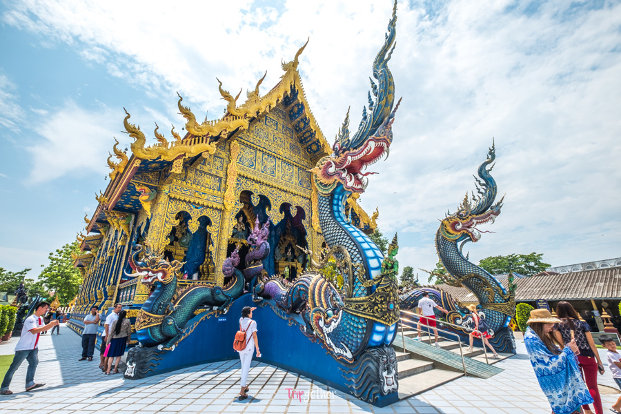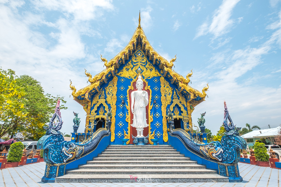 เมื่อเข้ามาถึงบริเวณหน้าวัดก็สะดุดตากับอุโบสถสีน้ำเงิน ซึ่งเป็นไฮไลต์ของวัด วัดนี้สร้างขึ้นโดยศิลปินชาวเชียงราย คุณพุทธา กาบแก้ว หรือสล่านก เป็นศิลปะแบบไทยประยุกต์ ด้านหน้ามีพญานาคขนาดใหญ่ปั้นด้วยลวดลายที่อ่อนช้อย แต่งแต้มสีสันสวยงาม