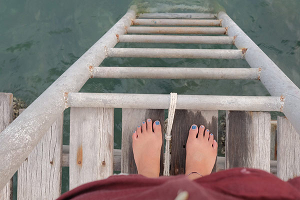 หลังจากเดินๆย่ำๆอยู่แถวหาด แบบพอให้เท้าเปียกน้ำทะเลนิดๆ เราก็ย้ายเป้าหมายใหม่ เดินไปสุดหาดนู่นเลยค่ะ เพราะเป้าหมายตอนเย็นของเราวันนี้คือไปดูพระอาทิตย์ตกที่แหลมไชยเชษฐ์กัน ระยะทางไม่ไกลมากค่ะ พอแค่ให้เหงื่อไหลนิดหน่อย มันจะเหนื่อยก็เพราะเดินบนทรายเนี่ยแหละ (จากหาดทรายแถวหน้าที่พัก มองไปก็จะเห็นแหลมอยู่แค่เอื้อมม) ก่อนจะไปถึงแหลม สายตาที่ฉับไวก็หันไปเห็นสะพาน สะพานยื่นไปกลางทะเล ใช่ มันคือสะพานยื่นไปกลางทะเล!! ไม่มีมุมไหนเหมาะแก่การถ่ายรูปเท่ากับมุมนี้แล้วว้อย (คิดในใจ) ไม่รีรอหักมุม เลี้ยวไปทางสะพานทันที 555 วิวดีมาก (ใครจะไปแหลมจะผ่านสะพานนี้ทุกคน) น้ำทะเลแถวสะพานนี่ใสมาก มีปลาด้วย ไต่บันไดลงไปได้เลย แต่หินเยอะหน่อย