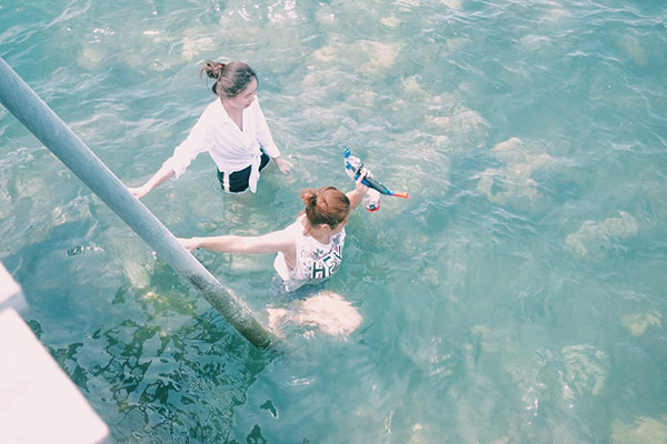 วันนี้ตอนแรกว่าจะไปดำน้ำกันค่ะ แต่ไปกันหลายคนตกลงกันไม่ได้ บางคนก็อยาก บางคนไม่อยาก สรุปไม่ได้ไป แล้วก็แยกย้ายกันค่ะ ใครอยากทำไรก็ทำ แล้วค่อยกลับมาเจอกันตอนเย็น เพราะเดี๋ยวไปบาร์ นี่ก็เลยมาหยิบสน็อคเกิ้ลที่โฮสเทลเดินไปตรงสะพานที่เมื่อวานไปมากัน สน็อคเกิ้ลนี่ฟรีนะ! มันจะมีโซนชั้นๆที่วางของเกี่ยวกับชายหาดให้ยืมไปใช้อยู่ เสื่อ แผ่นโยคะ ปิงปอง หนังสืองี้ ยืมไปใช้ได้เลย แต่เหมือนเดิมค่ะ ต้องเอามาคืนด้วยยยย เมื่อวานเราเห็นว่าน้ำใสมาก และปลาเยอะมาก เลยกะจะลองปีนบันไดลงน้ำซะหน่อย พอลงเท่านั้นแหละ น้ำขุ่นเลย 555 หินเยอะมากย้ำอีกรอบ ปลาหนีอีกลืมซื้อขนมปังไป