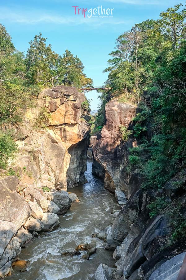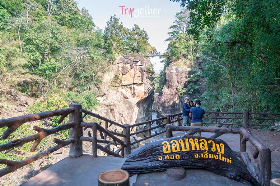จุดแรกที่เป็นไฮไลท์ของอุทยานฯออบหลวงคือ หน้าผาจูบกัน ที่มีสะพานระหว่างช่องเขาขาดและมีน้ำไหลผ่านอยู่ด้านล่าง