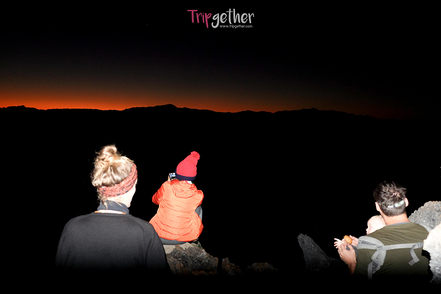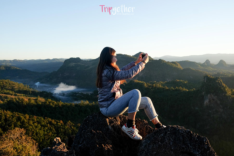 พอแสงจากพระอาทิตย์เริ่มสว่างภาพที่เราเห็นอยู่ตรงหน้าคือภูเขาที่สลับซับซ้อนกันไกลจนสุดสายตา และพระอาทิตย์ที่ค่อยๆ ขึ้น คล้ายกับโผล่ขึ้นมาจากภูเขา