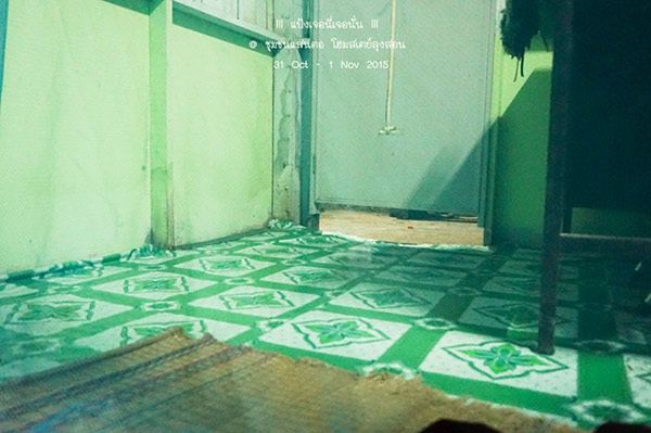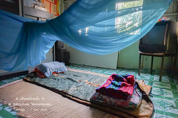 คุณลุงให้เราไปเก็บกระเป๋าและพาไปดูที่นอนในคืนนี้ เราได้นอนในห้องพยาบาล แต่เหมือนไม่ค่อยได้ใช้ จริงๆ แล้ว บ้านลุงสอนมีที่นอนสำหรับผู้ที่มาเข้าพักโดยเฉพาะ แต่วันที่เราไปมีพี่ผู้หญิงกับพี่ผู้ชายอีกคนเขาติดต่อมาก่อน ห้องนั้นสามารถนอนได้ 6-8 คน แต่เขามาเป็นคู่ เรามาคนเดียว เลยอัปเปหิตัวเองมานอนที่นี่ ที่ไหนก็นอนได้เราเป็นคนง่ายๆ (แต่ไม่ใจง่ายนะ) อยู่แล้ว ลุงสอนเตรียมที่นอนให้เรา เอามุ้งมากาง หาเสื่อกับถุงนอนมาปูให้ พร้อมพัดลม 1 ตัว ส่วนเครื่องนอนเดินไปหยิบได้ที่ห้องของพี่สองคน ส่วนผ้าเช็ดตัวพี่ๆ เขาหยิบมาให้ เสร็จแล้วที่นอนคืนนี้ ^^ไม่ได้นอนมุ้งมากนานมาก ตั้งแต่โลกใบนี้รู้จักกับเหล็กดัดและมุ้งลวด