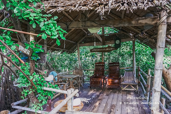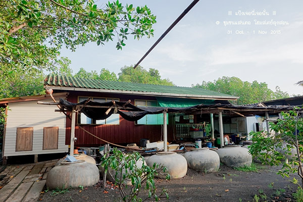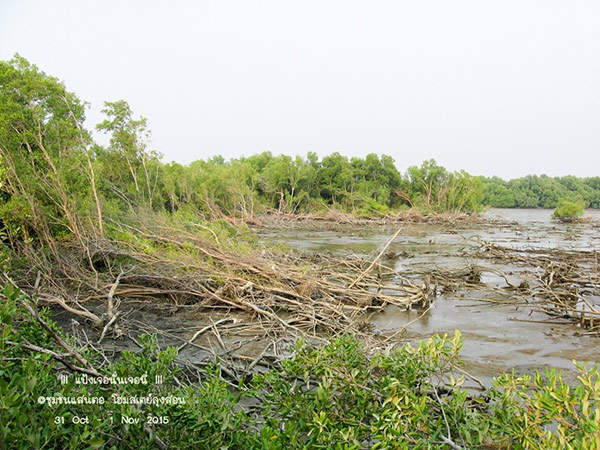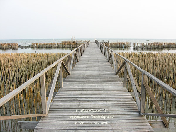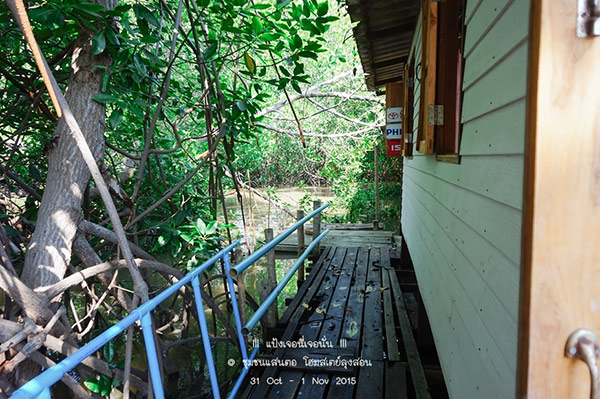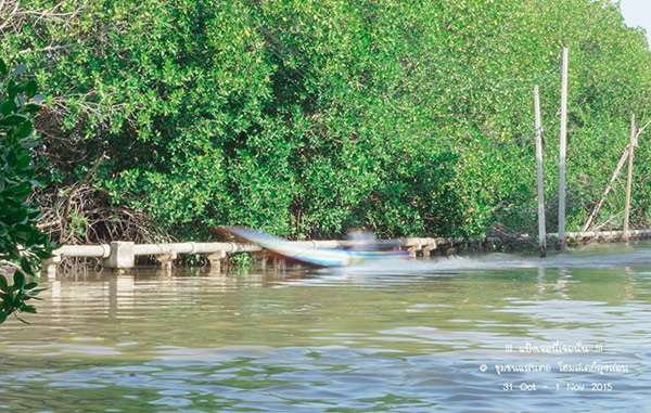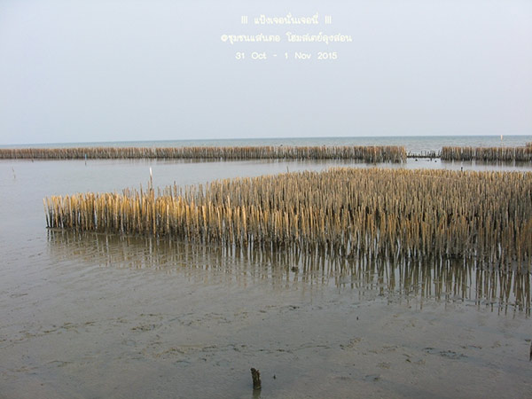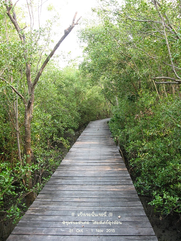 เรานั่งคุยกับลุงสอน ระหว่างนั่งรอกินมื้อเย็น เกี่ยวกับพื้นที่ป่าชายเลนในกรุงเทพฯ ลุงสอนบอกว่าเมื่อก่อน มีพื้นที่ป่าชายเลน 2,700 ไร่ เดี๋ยวนี้เหลือแค่ 200 ไร่ ภายในระยะเวลา 10-20 ปี เป็นข้อมูลน่าตกใจมากเลย ปัญหาที่ทำให้ป่าชายเลนเหลือน้อยคือปัญหาการกัดเซาะชายฝั่ง ตอนนี้ชาวบ้านก็เอาไม้ไผ่ไปปักทำเป็นแนวกั้นคลื่น เพื่อหวังว่าพื้นที่ป่าชายเลนจะกลับมา ใกล้ๆ ก็มีเส้นทางศึกษาป่าชายเลนนะ เป็นสะพานไม้ เดินไปเรื่อยๆ จะทะลุถึงส่วนที่เป็นทะเลกรุงเทพฯ ลุงสอนบอกว่า ก่อนที่เราจะมามีนักษาจะให้พาไปเดินทางสะพานไม้ แต่ช่วงนี้ลุงสอนไม่แนะนำให้ไปค่ะ เนื่องจากยังมีฝน ยุงจะเยอะมาก ถ้าใครอยากไปรอให้หมดฝนก่อนนะ เราเคยไปมาเมื่อปี 2555 ขอนำรูปเก่าๆ มาลงให้ดูจะได้เห็นแนวกันคลื่นที่ชาวบ้านร่วมกันทำ และปัญหาการกัดเซาะชายฝั่งได้ชัดขึ้น ขอย้ำนะคะว่าเป็นรูปปี 2555