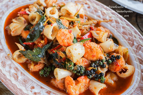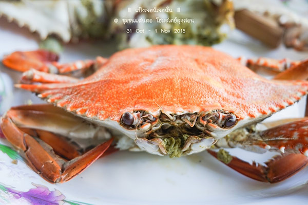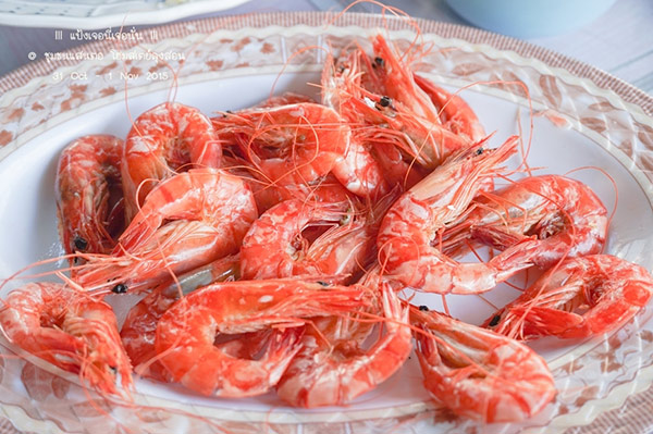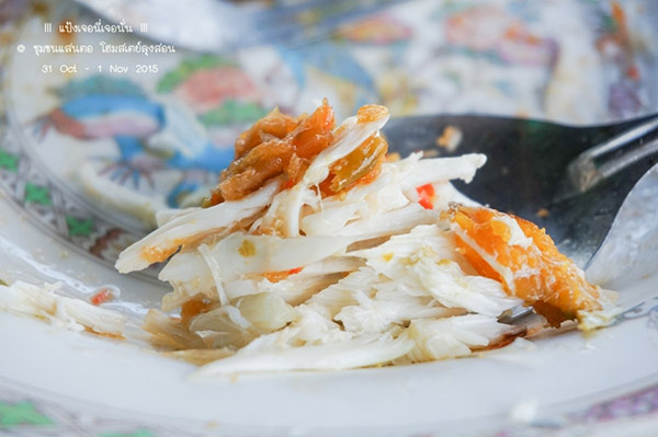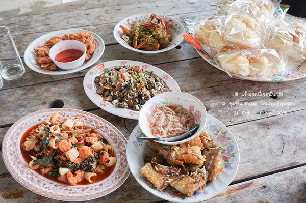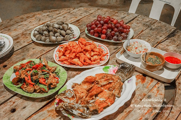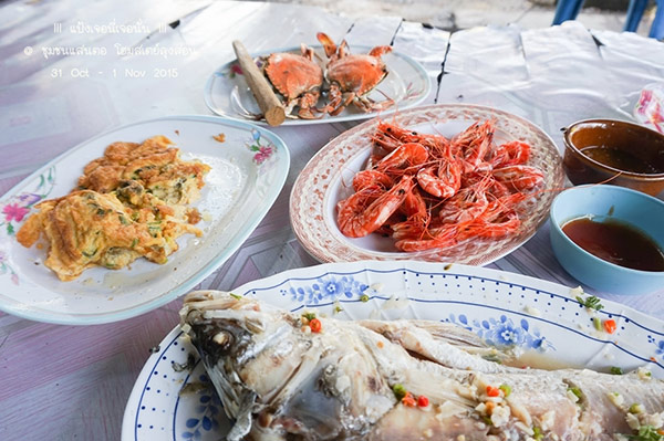 พอเราเก็บกระเป๋าก็ขอขึ้นไปทักทายป้าเอื้อน เราขึ้นไปสวัสดีคุณป้า ป้าเอื้อนทักทายเราด้วยสำเนียงสาวเพชรบุรี คุณป้ายิ้มตลอด อารมณ์ดีมากๆ สักพักลุงสอนก็เดินมาถามว่า แป้งกินอะไรมาหรือยัง? รีบบอกว่ายังก่อนเลย (แล้วข้าวมันไก่พิเศษข้างปั๊มน้ำมันตรงบิ๊กซีพระราม 2 เมื่อกี้คืออะไร ๕๕๕) ด้วยความที่เรามาช้า พี่สองคนที่มาก่อนกินกันไปแล้ว เราไม่รังเกียจที่จะกินต่อนะ เพราะอาหารทุกอย่างน่ากินมาก เป็นของหนูคนเดียวด้วย ป้าบอกว่ากินให้หมดนะ เราส่งยิ้มแห้งๆ ไป แทบจะขย้อนข้าวมันไก่ทิ้ง ป้าเอื้อนย้ำมาอีกว่า ปลาครึ่งตัวน่ะ กินให้หมดเลยนะ มองปลาก่อนเลย…เราไม่ชอบกินปลา แต่! เราจะมีข้อตกลงกับตัวเองว่า ถ้าไปไหนแล้วมีอาหารต้อนรับเอามาให้ด้วยน้ำใจ เราต้องรับและกินให้ได้เยอะที่สุด บางทีมารยาทกับตะกละมันก็มีเส้นบางๆ คั่นอยู่ มาดูดีกว่ามีเมนูอะไรบ้าง มีทั้งหมด 4 เมนู ปลานึ่งมะนาว ปูนึง กุ้งต้มเค็มหวาน และไข่เจียวหอยนางรม