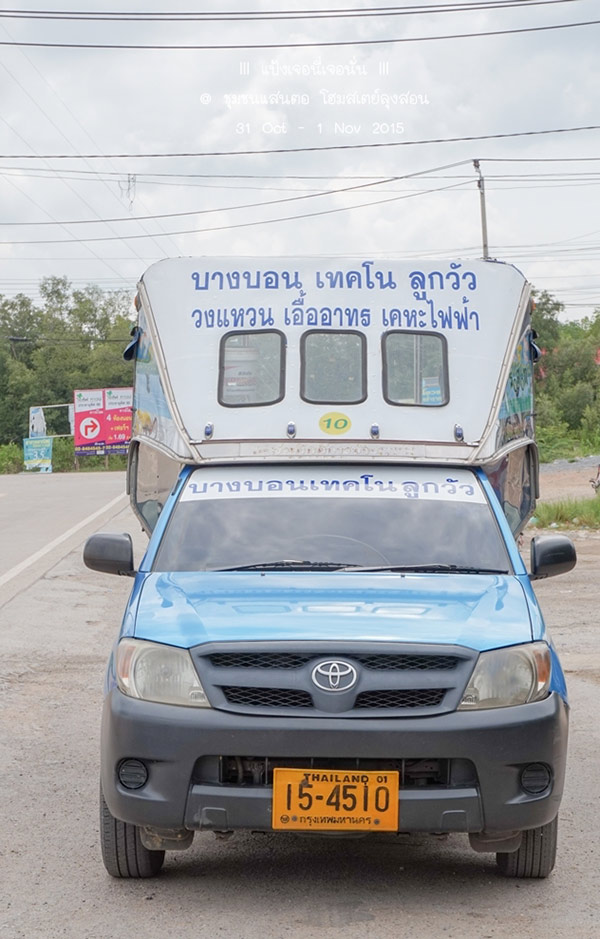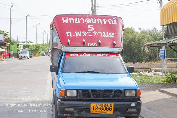 หน้าบิ๊กซีจะมีรถสองแถววิ่งหลายสาย ให้ดูคันสีน้ำเงิน แต่!!! ต้องเป็นคันสีน้ำเงินที่เขียนว่า บางบอน-เทคโนฯ-ลูกวัว ดูดีๆ นะ เพราะรถสองแถวสายอื่นก็สีน้ำเงิน รถสองแถวคันนี้ไปไม่ถึงโรงเรียนคลองพิทยาลงกรณ์นะคะ ก่อนขึ้นบอกเขาว่าจะไปต่อรถสองแถวเข้าโรงเรียนคลองพิทยาลงกรณ์ ถึงแล้วจอดให้ด้วยนะคะ รถสองแถวจะส่งเราที่ศาลาก่อนจะเลี้ยวเข้าซอยเทียนทะเล 25 เราก็ยืนรอรถสองแถวหัวแดงฝั่งนั้นเลย ค่ารถสองแถว 8 บาทค่ะ (นี่คือหน้าตาของรถสองแถวสายลูกวัว)