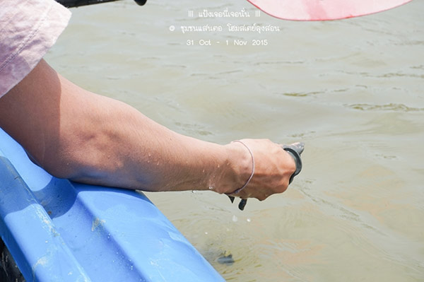 ลุงสอนหน้าดุก็จริงนะ จะไม่ค่อยพูดอะไรเท่าไหร่ แต่ถ้าเรามีคำถามเกี่ยวกับสิ่งแวดล้อม ความเป็นมาของที่นี่ คุณลุงสามารถตอบได้หมด มีอีกเรื่องที่เราสนใจ น้ำขึ้นและน้ำลง  อยากรู้ว่าเกี่ยวกับดวงจันทร์ยังไง? การดูปฏิทินจันทรคตินับยังไง? ครั้งก่อนเรามาที่นี่เดือนกรกฎาคม ช่วงนั้นตอนเช้าน้ำลดแทบจะจอดเรือไม่ได้ ลุงสอนบอกว่าอีกสองเดือนน้ำจะขึ้นช่วงเช้า และลดลงช่วงสายๆ สลับกัน แล้วก็เป็นจริงๆ ครั้งนี้ที่เรามาป้าบอกว่าถ้ามาเร็วกว่านี้จะให้พายเรือเล่นหน้าบันไดบ้าน เราเลยข้องใจมากว่าจะรู้เรื่องพวกนี้ได้ยังไง เลยถามคำถามไปเยอะมาก ลุงสอนตอบมาสั้นๆ ว่า อธิบายไม่ได้หรอก ต้องอยู่ที่นี่นานๆ นั่นสินะ มันก็เหมือนคำตอบในหลายๆ สิ่งที่เราอยากรู้ แต่เราไม่เคยที่จะสังเกต หรือ พิจารณาความเป็นไปและเป็นมาของสิ่งเหล่านั้นเลย ของบางอย่างต้องใช้เวลาจริงๆ ความรักก็เช่นกัน พี่ๆ สองคนพายเรือกลับมาพร้อมปลากุเลาตัวน้อยๆ 1 ตัว