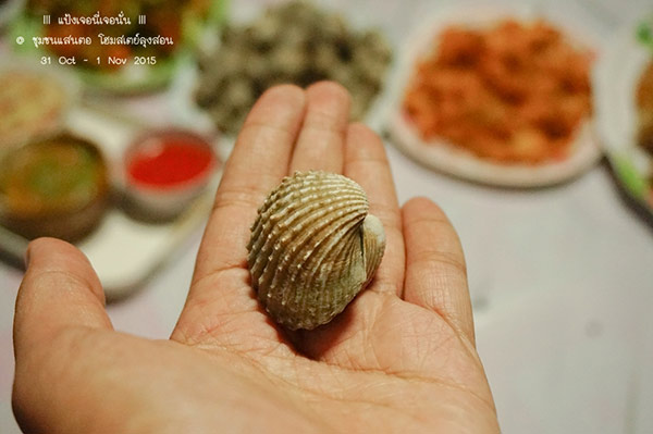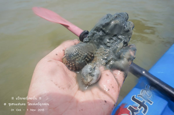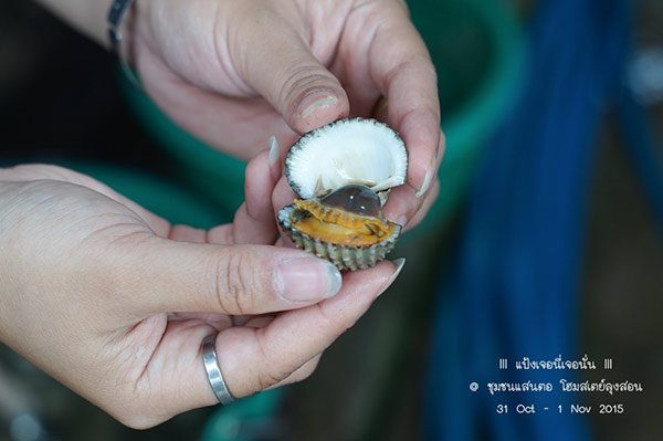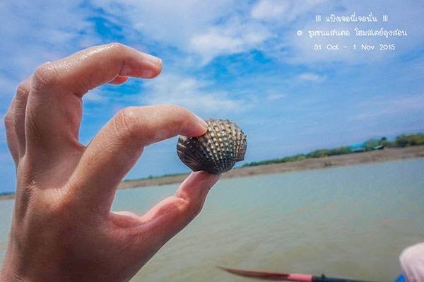เรานั่งกินข้าว ไม่ใช่สิ!!! กินกับข้าวตั้งแต่บ่ายสองหน่อยๆ จนถึง อีก 15 นาทีจะสี่โมงเย็น ปลาหมด!!! กุ้งไม่เหลือ!!! ปูหาย!!! เหลือแต่ไข่เจียวหอยนางรม ไม่ไหวจริงๆ ตกใจตัวเองมาก กินไปได้ยังไง พวกน้ำจิ้มป้าเอื้อนจะทำรสชาติหนักไปทางเปรี้ยว เข้าทางเรามาก ฟาดเรียบเลย หลังเอาจานไปล้าง ลุงสอนบอกขอบใจนะที่ช่วยล้าง  ถึงจะจ่ายเงินมาแต่เรามองว่าที่นี่เหมือนบ้านมากกว่า เพิ่งเก็บโต๊ะเสร็จ ป้าเอื้อนลงมาทำกับข้าวอีกแล้ว หืม ต้องหาอะไรทำให้อาหารย่อย ครั้งที่แล้วมาพายเรือคายัคเก็บหอยแครงกับเพื่อนๆ ครั้งนี้มาคนเดียวลากเรือลงน้ำไม่ไหว เลยขอนำภาพจากครั้งที่แล้วมาให้ดูนะคะ หอยแครง กุ้ง ปู ลุงสอนเลี้ยงแบบธรรมชาติ ไม่ต้องให้อาหาร เลยไม่จำเป็นต้องมีที่ตีอากาศ (เขาเรียกว่าอะไรอ่ะ ที่อยู่ในบ่อกุ้ง หมุนๆ เหมือนกังหันน้ำอ่ะ)