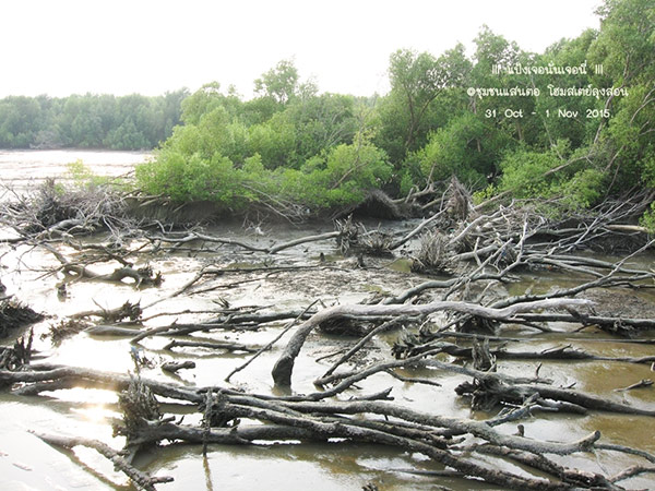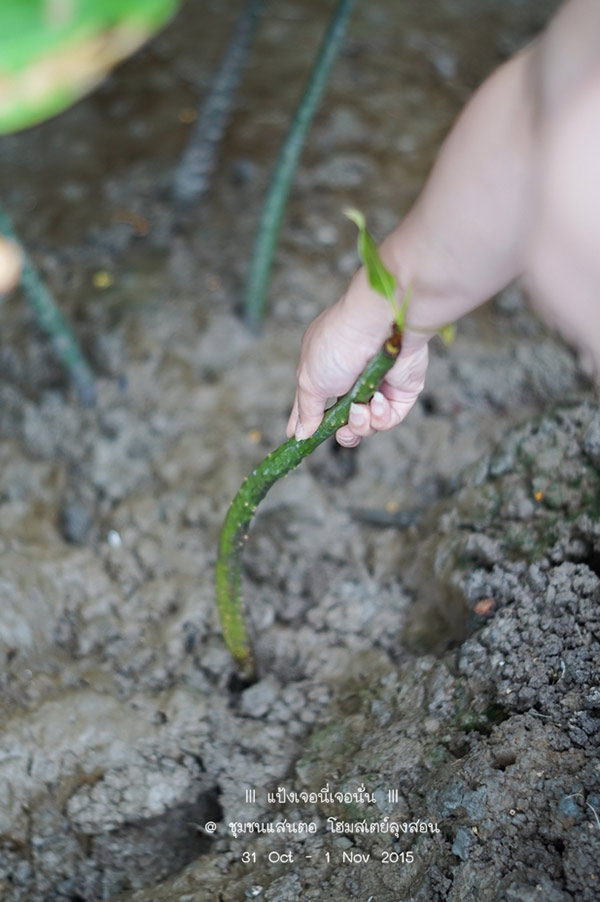 ช่วงน้ำลดใครอยากปลูกต้นโกงกางก็เดินเก็บฝักใต้ต้นเลย แล้วหาที่ปักลงไป