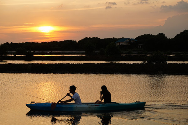 ฝากรูปให้พี่เน่กับพี่มุก เผื่อพี่ๆ ผ่านมาเจอรีวิวนี้ แป้งแอบถ่ายพี่สองคนไว้ พี่ๆ สองคนก็ลากเรือออกไปตกปลากัน ท่ามกลางพระอาทิตย์ตกดินสุดโรแมนติก เราก็นั่งหงอยอยู่บนคันนา ที่บ้านลุงสอนมีคันเบ็ดค่ะ ใครอยากตกปลาสามารถพายเรือไปตกในบ่อได้