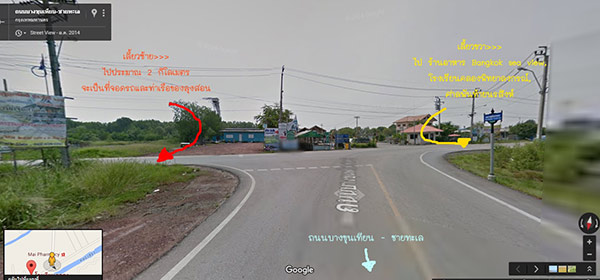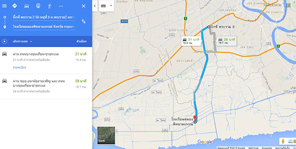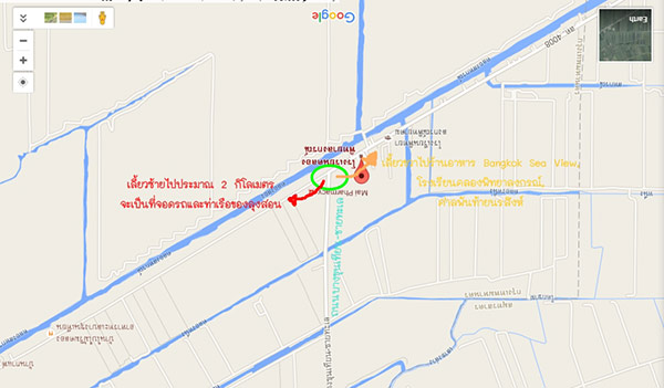 เราไม่สันทัดในการเดินทางโดยวิธีนี้เพราะเราเดินทางมาโดยรถประจำทาง โทรถามลุงสอนเรื่องที่จอดรถกับนำเรือมารับอีกทีนะคะ ข้อมูลจะได้แน่นอนกว่านี้ วันที่เราไปมีพี่อีก 2 คน นำรถส่วนตัวมา เราถามลุงสอนว่าถ้านำรถส่วนตัวมาสามารถไปจอดได้ที่ไหน ลุงสอนบอกว่าหลานลุงเขามีที่อยู่ใกล้ๆ สามารถจอดรถได้ และลุงสอนจะเอาเรือไปรับที่นั่นเลย เพราะท่าเรือตรงที่จอดรถจะอยู่ใกล้กว่าท่าเรือหน้าโรงเรียนคลองพิทยาลงกรณ์ เราไปเอาภาพมาจาก Googleแหละ เผื่อจะทำให้เห็นภาพมากขึ้น (มั้งนะ) เส้นทางจากบิ๊กซีพระราม2 เราใช้จุดหมายปลายทางในการค้นหาเส้นทางเป็นโรงเรียนคลองพิทยาลงกรณ์นะ เพื่อให้เห็นว่ามาทางเส้นบางขุนเทียน-ชายทะเล