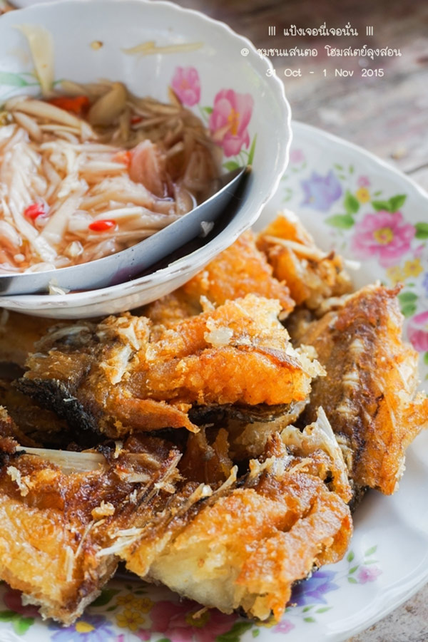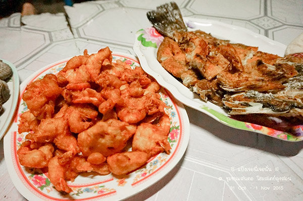 จัดเต็มอีกแล้ว มีปลาทอดน้ำปลามาพร้อมน้ำราดที่ทำจากมะม่วงเปรี้ยวรสชาติซี๊ดซ๊าดมากกกกก หอยแครงลวกจากในนาของลุงสอนตัวใหญ่จริงอะไรจริง ปูผัดผงกะหรี่รสชาติเข้มขนหอมเครื่องแกง จานสุดท้ายเราชอบสุด กุ้งชุบแป้งทอดกร๊อบกรอบ แอบเอาน้ำราดปลามาราด ฟินไปสามโลก