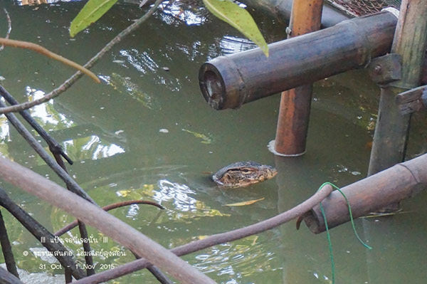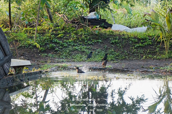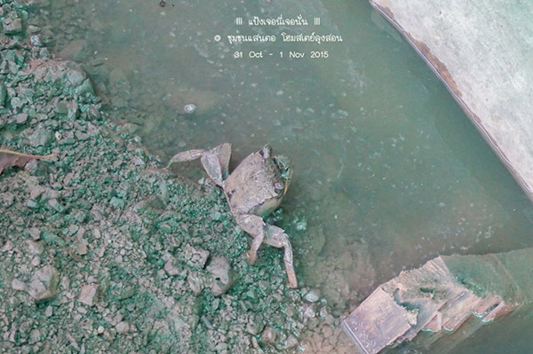 จะเห็นได้ว่าสัตว์น้ำที่นี่อุดมสมบูรณ์มาก หาได้ง่ายๆ แบบนี้เลย เราเลยคิดอะไรเล่นสนุกๆ คนเดียว จะเดินสำรวจรอบๆ บ้านว่ามีสิ่งมีชีวิตอะไรอีกไหม? การเดินรอบบ้านเช้านี้ลำบากหน่อย เพราะส่วนใหญ่เป็นพื้นดิน เมื่อคืนฝนตกด้วย เดินไปเดินมาดินติดรองเท้าแตะกลายเป็นส้นตึกเลยทีเดียว เราเห็นลุงสอนถอดรองเท้าเดิน เลยลองบ้าง ก็เละเหมือนเดิม แต่คล่องกว่าใส่รองเท้า มาเจอตัวแรก อุทานเลย เห้! เจอกันจังๆ ยืนจ้องตากันอยู่แป๊ปนึงเดาใจเธอไม่ออกว่าจะไปทางไหน เราจะได้หลีกทางให้สุดท้ายเธอเลือกลงน้ำและหายไป