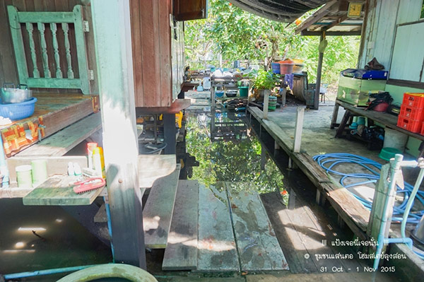 สายๆ น้ำเริ่มขึ้น เหตุการณ์มันคุ้นมากๆ เหมือนปีที่น้ำท่วมใหญ่เลย แต่ที่นี่ประมาณ 10 โมงน้ำก็จะค่อยๆ ลงแล้วค่ะ