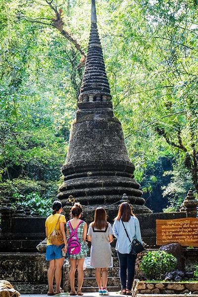 ที่นี่มีเจดีย์ด้วย เราว่าเก๋อ่ะ อยู่ท่ามกลางป่าและน้ำตก ไปหาข้อมูลในเนตมาได้ความว่าชื่อ “อลงกรณ์เจดีย์” รัชกาลที่ 5 ทรงโปรดให้สร้างในปี 2419 เพื่อเป็นที่ระลึกในการเสด็จประพาสน้ำตกพลิ้วพร้อมสมเด็จพระนางเจ้าสุนันทากุมารีรัตน์ ในภาพคือการยืนชื่นชมความงามของเจดีย์