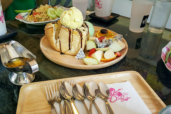ข้าวผัดปู 40 บาท ถูกมาก อร่อยมากด้วย ส่วนโทสอันนี้เราว่าขนมปังแข็งไปหน่อย แต่น้ำปั่นอร่อยดี คึอตอนแรกคุยกันว่ากินเบาๆพอ เพราะเดี๋ยวเข้าที่พักก็มีมื้อเที่ยงรออยู่แล้ว สุดท้ายคือ… อิ่มจุก