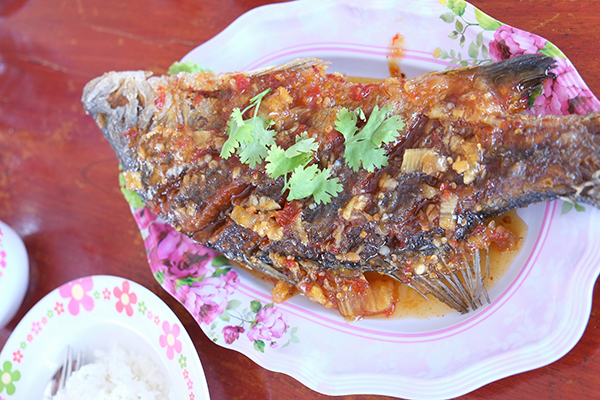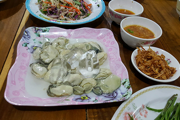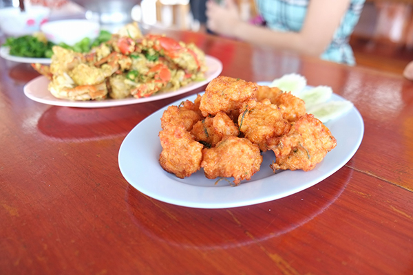 ลุยน้ำตกเสร็จ รู้สึกหิวมาก ยังไม่ได้กินอะไรแต่เช้า คิดไม่ออกว่าจะไปหาร้านอะไรกินดี เลยไปถามเจ้าหน้าที่น้ำตก แนะนำร้านชบา ติดชายหาดแหลมสิงห์ ไปถึงร้านกำลังเปิดพอดี สั่งข้าวผัดปูร้านตรงข้ามมากินด้วย น่าจะเป็นเจ้าของเดียวกัน