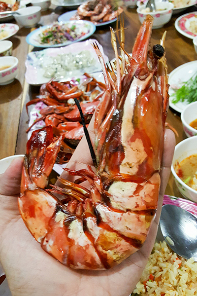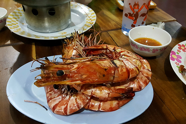 กุ้งนี่ก็ตัวใหญ่มาก เนื้อแน่นมาก ส่วนตัวเราชอบกุ้งแม่น้ำมากกว่า เพราะเราชอบกินหัวกุ้ง กุ้งพันธุ์นี้มันไม่มีมันในหัวกุ้งเลยอ่ะ และเซ็งสุดคือ ตะกละไปกินตัวใหญ่ที่สุด ขนาดเท่าฝ่ามือเลย พอกินตัวเดียวอิ่มจุก กินอย่างอื่นต่อไม่ได้ เพลียตัวเอง