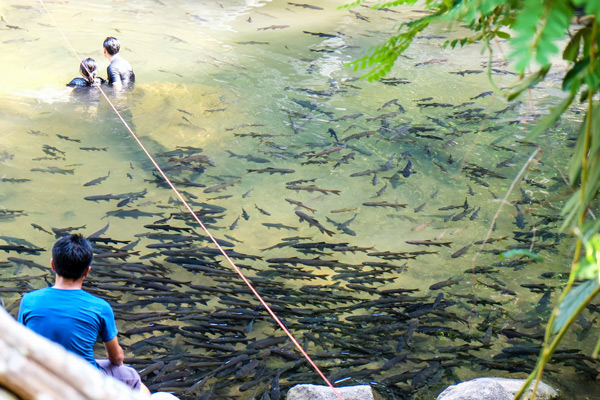 เราไม่เคยมา แต่ทราบว่าสมัยก่อนสามารถให้อาหารปลาได้ เช่นพวกถั่วฝักยาว แต่ปัจจุบันเค้าห้ามให้อาหารปลาแล้วนะคะ