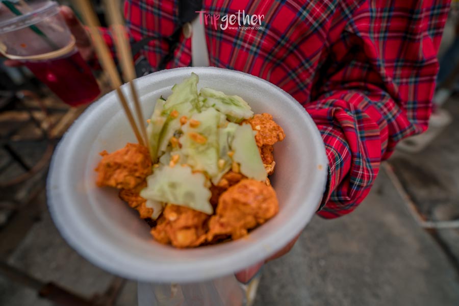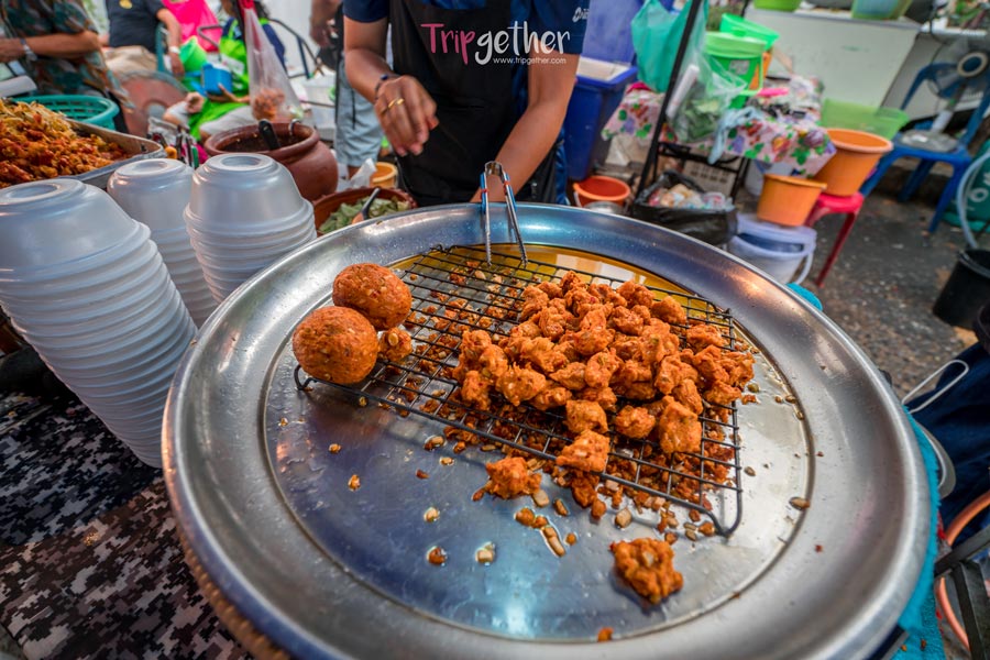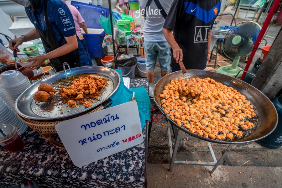 ขอนั่งย่อยสักพัก บ่ายโมงกว่าๆ ไปเดินเล่นต่อในตลาดดีกว่า ระหว่างเดินก็ทานของทานเล่นจุกจิกมาตลอดทาน แต่ที่สะดุดตาคงหนีไม่พ้น ลูกชิ้นปลากลายหน่อกะลา คือเดินผ่านหลายร้านมาก แต่คนเยอะเลยยังไม่ได้ซื้อ แต่ปักไว้ว่าต้องกลับมาซื้อแน่ๆ